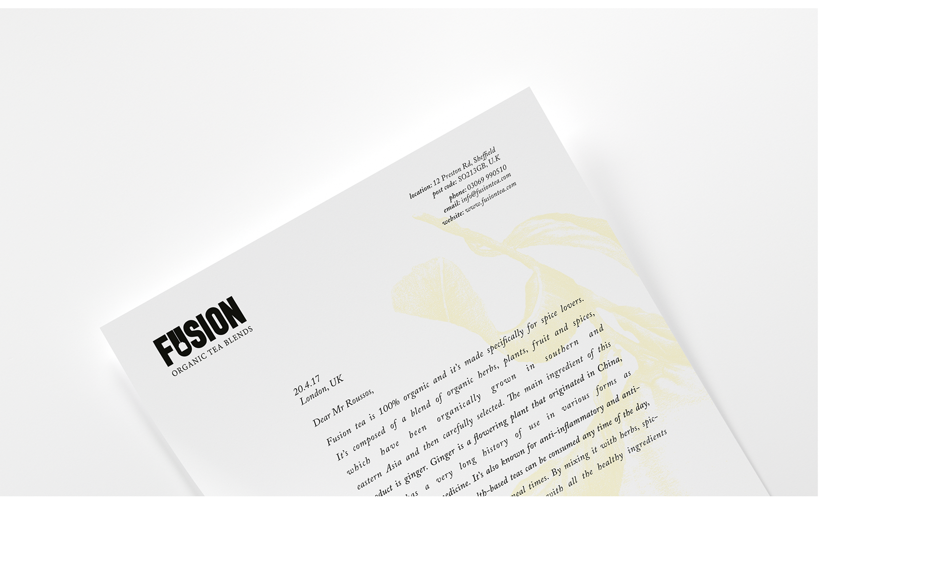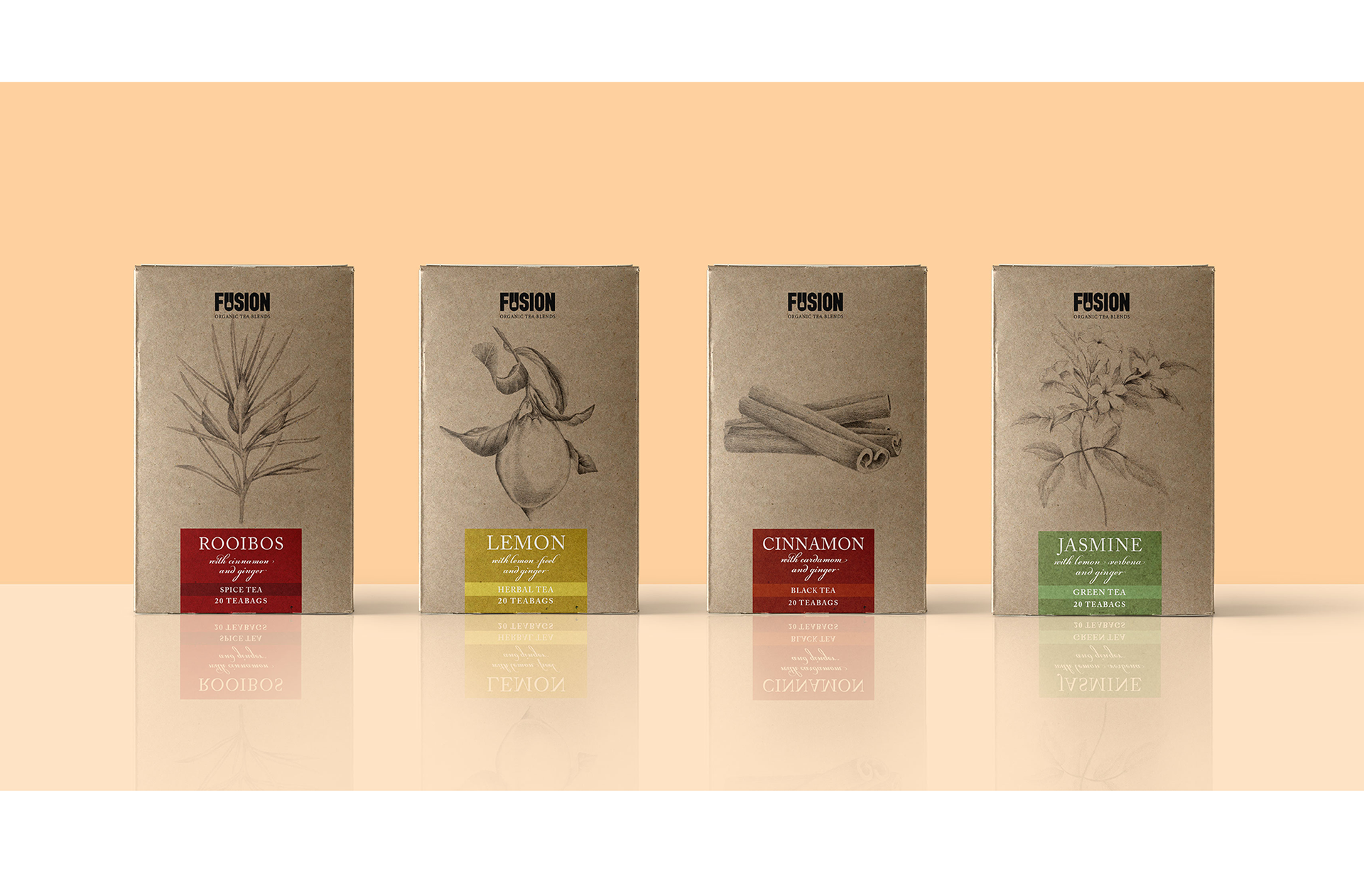 Fusion organic tea blends produces tea products consisting of four different flavour combinations, the main constituent of which is Ginger. The company has four different varieties of tea: Spicy, Herbal, Green and Black tea. The combination of classic aromas and delicacies are Lemon, Rooibos, Jasmine and Cinnamon, with a blend of spices. Fusion products also include both white and brown sugar.